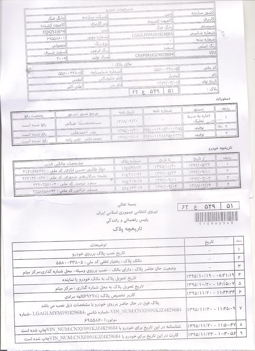 از پلیس راهور تاریخچه وسیله نقلیه گرفته شود . تاریخچه خودرو دارای تاریخ شروع مالکیت و تاریخ پایان مالکیت مالکین خودرو است . نمونه ان در پیوست گذاشته شده است
